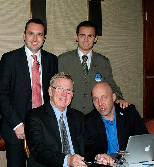 Arriba de pie, José Miguel Gil, Presidente de ASESCO, a la derecha Carlos Pardo, presidente de ASOCOACHING, Asociación Colombiana de Coaching. Sentados, Ron Jenson, Coach Norteamericano y Damian Goldvarg, Presidente de ICF Mundial